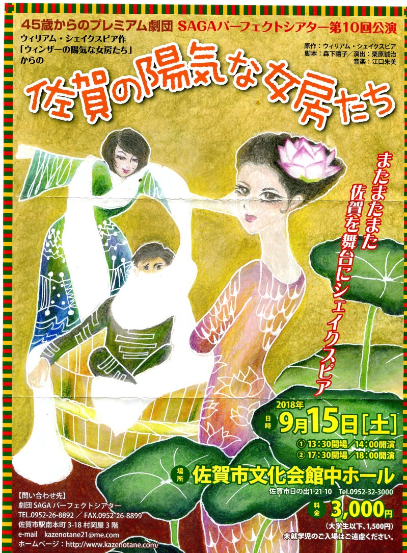 われらがアイドル森下(千々岩)禮子さんの執筆した脚本の劇「佐賀の陽気な女房たち」(原作シェークスピア)が、またまた佐賀の佐賀市文化会館ホールで開演されます。シェークスピアを懐かしの佐賀弁で愉しむ、誠にまあ、素晴しい、というの外ありません。