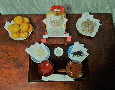 ご覧の通り鏡餅は玩具の様なものです。その前に、ミカンと干し柿、お屠蘇を入れた木製のもの、それに三重の木杯、お屠蘇を戴くときに添えるするめと昆布とお清めの塩を置きます。