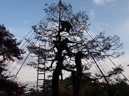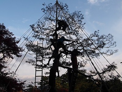 また、いまは丁度、木々の冬支度である金沢の風物詩「雪吊り」のシーズンで、庭師さんが木に登り「雪吊り」を作っているところにたまたま出くわした。