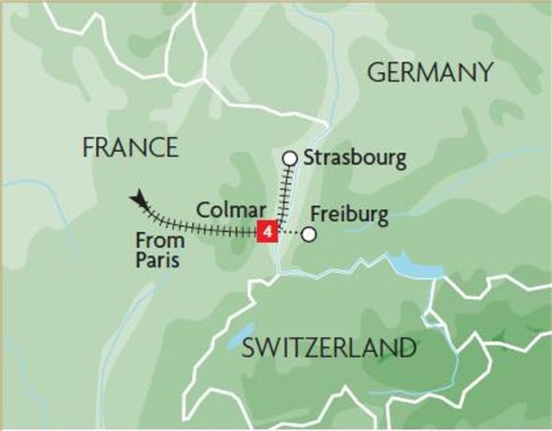 最初はコルマール市周辺の地図、スイスの右上にあるボーデン湖がライン川の始まりで、コルマール市地域はドイツとの