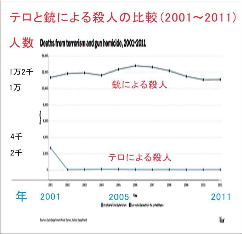 銃とテロによる死者の毎年の合計を2001から2011年まで表したグラフ、テロは下の線、2001年に多いのは9/11事件、