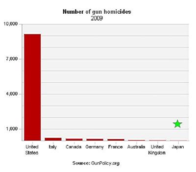 二番目の画像は2009年に起こった銃による殺人の数、これもアメリカが飛び抜けて多く9千人以上、一番少ないのが