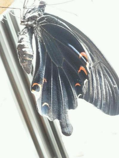 関ヒマ様。写真をここに載せるときは トト様にお世話にならなければ ダメな私ですが、この蝶が蛹から出てきたばかりの写真をトト様に送りましたので見てください、蝶の裏側に赤い半円が見えます。関ヒマ様がお庭で見られた蝶と同じかと。