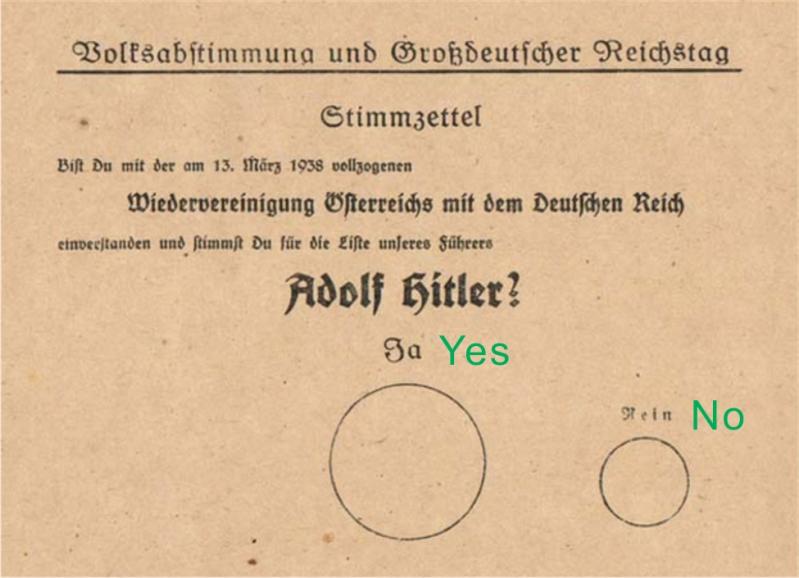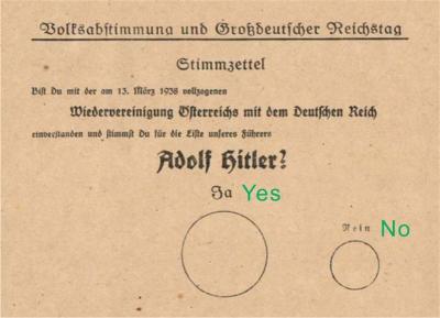 1938年3月13日に達成したオーストリア合併を認め、ヒトラー宰相のリストへ投票しますか?
