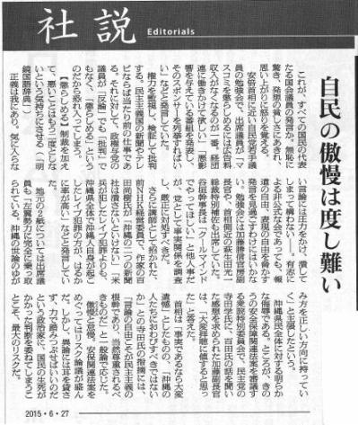 「自民党は27日、安倍晋三首相に近い議員でつくる勉強会『文化芸術懇話会』で沖縄の地元紙を含む報道機関を威圧する発言などが出た問題に関連し、懇話会代表の木原稔・党青年局長を更迭し、1年の役職停止処分とすることを決めた・・・」